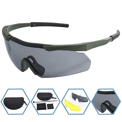 Polycarbonate glasses protect your eyes and offer five interchangeable lenses with different color tints to help you see targets better under all light conditions.